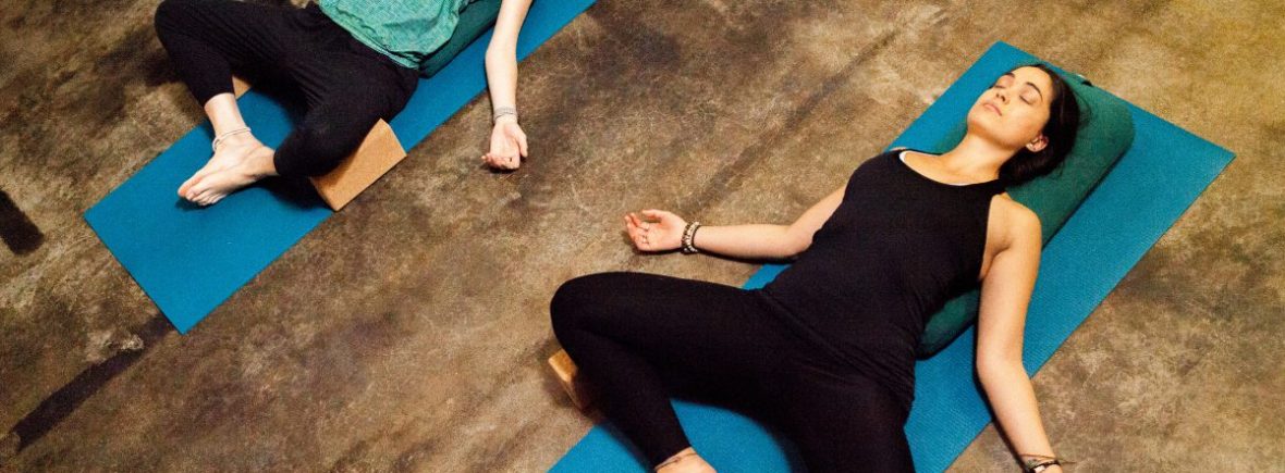 - Ontspanningshoudingen uit de restorative yoga, om spanning uit je lichaam weg te laten vloeien (die vaak pijnlijke schouders en rug) en energie op te laden.